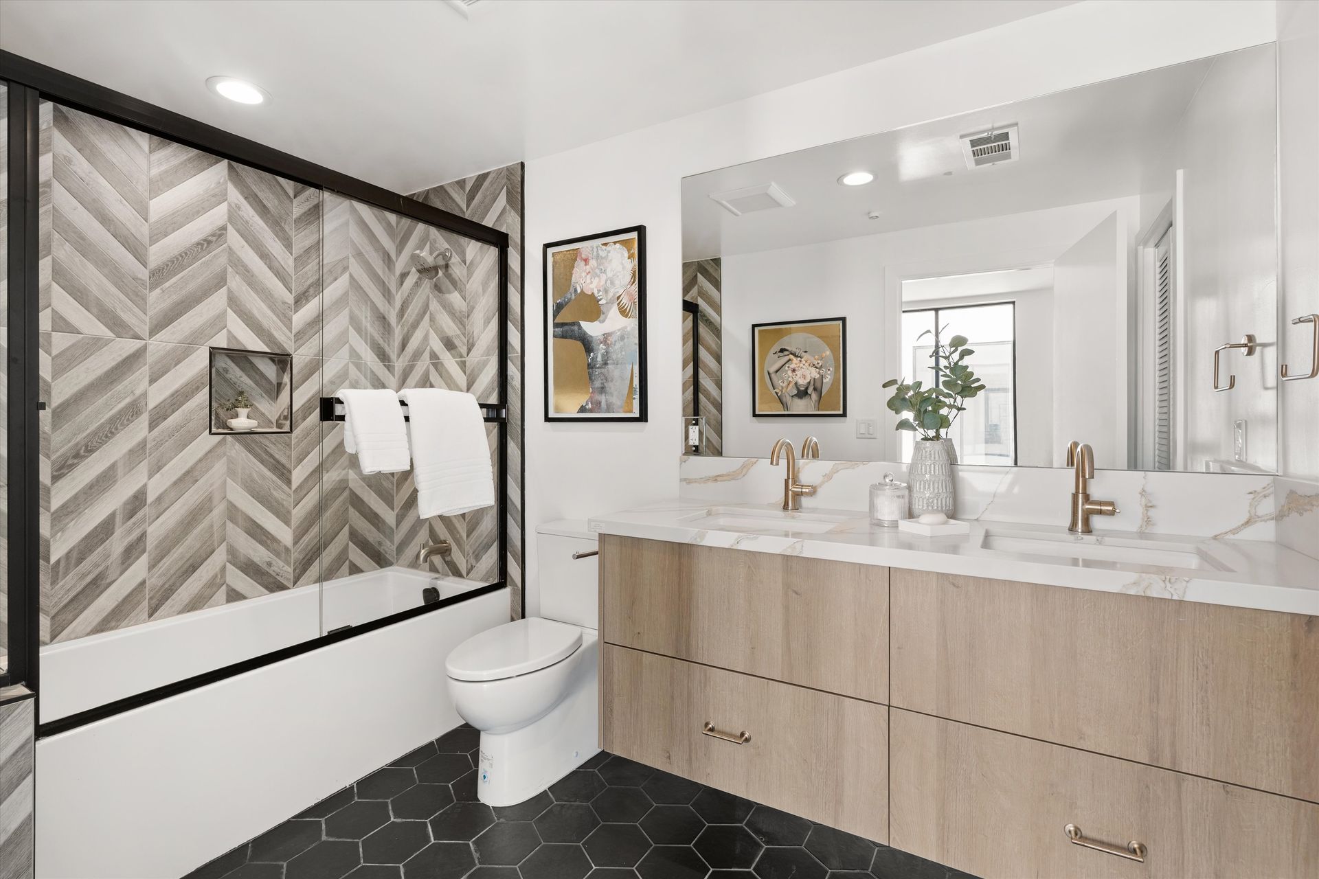 Upscale finishes, including designer tiles, modern glossy cabinets, and natural wood waterproof vinyl, etc.